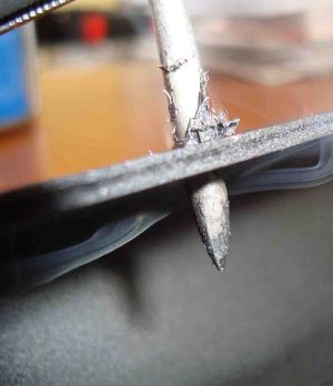 Στη συνέχεια τρύπησα τη δερματίνη στα σημεία που είχα ανοίξει το αλουμίνιο με πυρωμένο καρφί