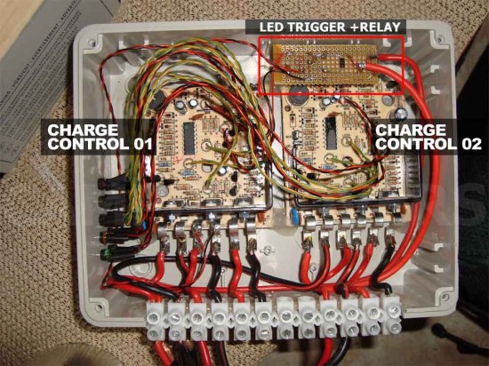 Δείτε ότι το ρελέ (RELAY) είναι συνδεδεμένο έτσι ώστε να είναι ενεργοποιημένο, παίρνοντας τάση από το LED TRIGGER, όταν έχουμε περίσσευμα ενέργειας (πάνω από 75% της HOME BATTERY). Με αυτόν τον τρόπο (που είναι ανάποδος απ΄ότι συνήθως) το ρελέ δεν επιβαρύνει τη μπαταρία μας με την κατανάλωσή του (5mA οπλισμένο) σε δύσκολες στιγμές.