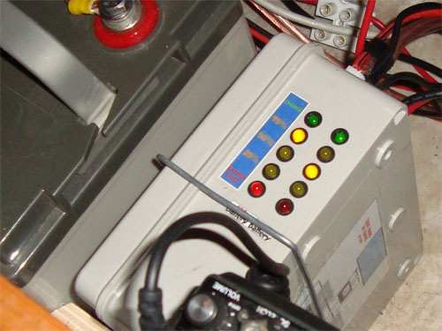Δείτε ότι η πρώτη σειρά των led (δεξιά), δείχνει πτώση στο 50%, οπότε και η συσκευή έκοψε την τάση που πάει στην άλλη μπαταρία (μπαταρία της μηχανής – αριστερή στήλη με led).