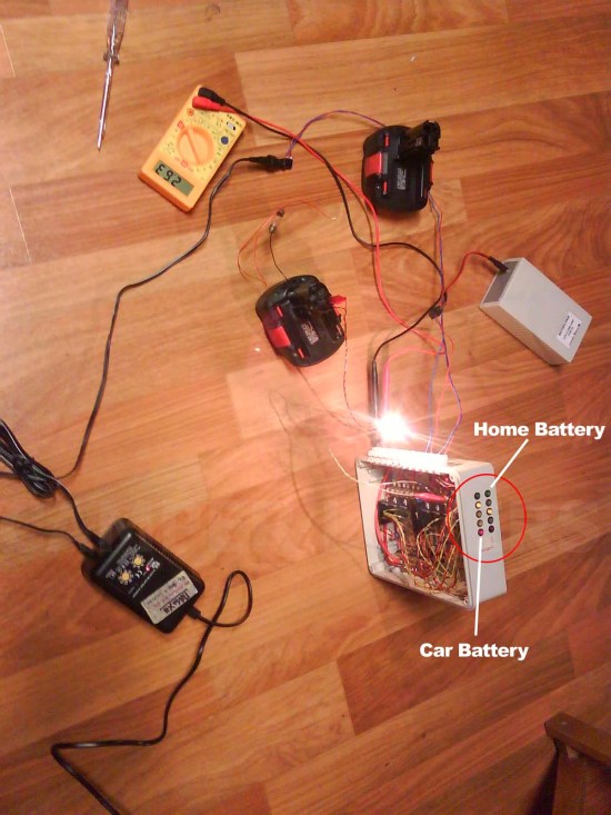 Εδώ μια φωτογραφία της κατασκευής κατά τη δοκιμή που έγινε με ένα τροφοδοτικό στη θέση της πηγής (αντί για φωτοβολταϊκά) και στη θέση των μπαταριών κάτι περίσσιες επαναφορτιζόμενες.