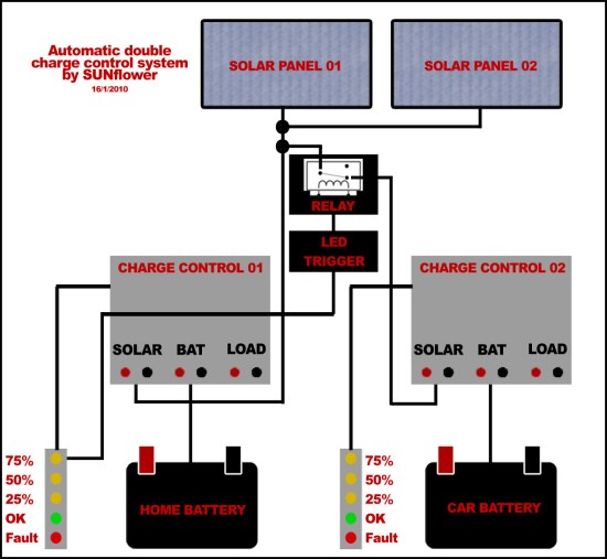 Σκέφτηκα λοιπόν, ότι θα μπορούσα να βάλω δύο φορτιστές που να δίνουν σε κάθε μια μπαταρία ξεχωριστά (απομόνωση) και να πάρω μια εντολή από το τρίτο led (75%) του πρώτου (σπιτιού), ώστε να οδηγήσω ένα ρελέ που θα απομόνωνε τον δεύτερο φορτιστή (μηχανής), με αποτέλεσμα να μη πηγαίνει ενέργεια στη μπαταρία του.
