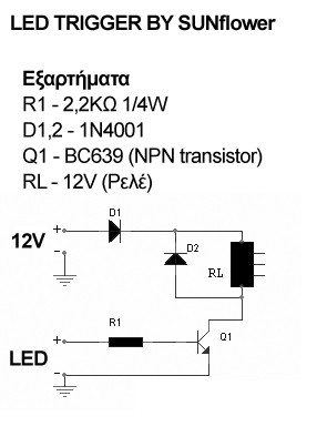 - Ένα LED TRIGGER (ανιχνευτή τάσης) που οδηγεί ένα ρελέ 12V