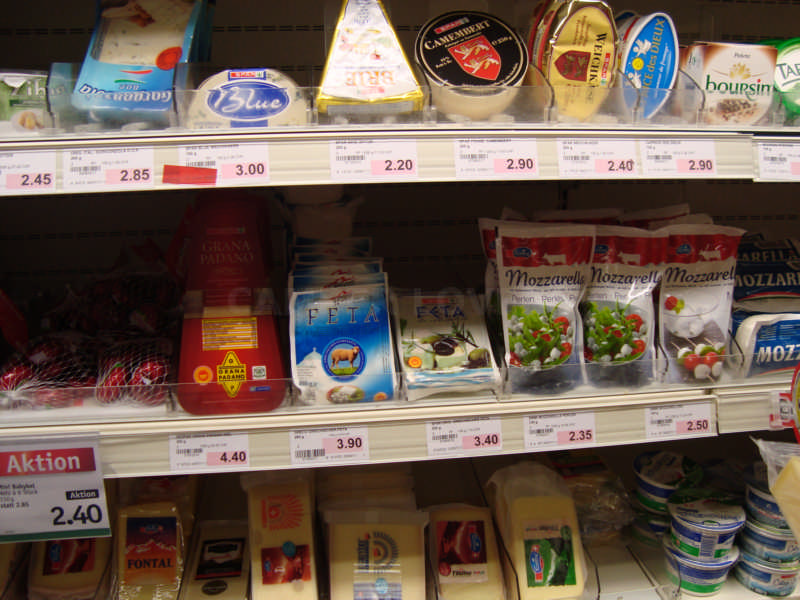 Μέσα, ελληνικό τυρί φέτα (ΠΟΠ). Το αγοράσαμε και ήταν κακό (παραγωγή φασόν για την αλυσίδα super market SPAR, κάπου στο Κιλκίς) .