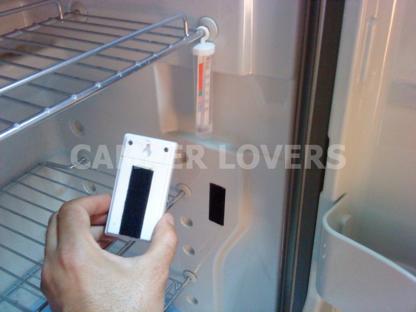 Απαραίτητο εργαλείο παρακολούθησης αφού τα ¨ατυχήματα¨ είναι συχνότατα. Αν ήμουν κατασκευαστής θα το έβαζα σε όλα μου τα ψυγεία στον στάνταρ εξοπλισμό τους. Αυτό, είναι μπαταρίας αγορασμένο από Super Market 12,5Ε. Αποτελείται από: α) έναν ασύρματο αισθητήρα εξωτερικού χώρου (πομπό), τον οποίο τοποθέτησα στη συντήρηση του ψυγείου με αυτοκόλλητο velkro (χρατς) και β) από τον πίνακα (δέκτη), που έχει επάνω του έναν ακόμη αισθητήρα και τον έχω βάλει σε ένα ντουλάπι. Έτσι, δεν χρειάστηκε να τρυπήσω το ψυγείο για να περάσω καλώδια, που με θλίψη μου βλέπω να κάνουν οι αντιπρόσωποι.