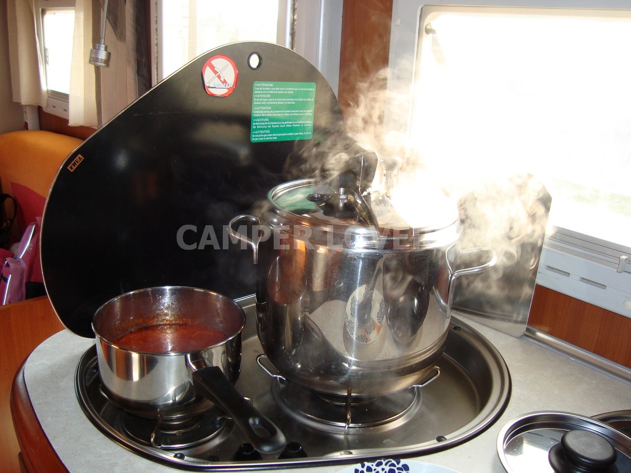 Αυτός ο τρόπος δεν μας πολυταιριάζει αλλά δε λέμε όχι σε μια καλή τηγανιτή πατάτα ή κανένα αυγό, κλπ. Με το αυγό βέβαια δεν υπάρχει πρόβλημα, μπορεί να γίνει μέσα στο αυτοκινούμενο με τον εξαεριστήρα αναμμένο και καπάκι. Η τηγανιτή πατάτα όμως, η μπριζόλα, τα ψάρια, κλπ, βγάζουνε καπνό, πολλές μυρωδιές, πιτσιλάνε, κλπ. Είναι σχεδόν απαγορευτικό να γίνουν μέσα. Μια λύση είναι, αν ο καιρός βολεύει, να στήσετε ένα γκαζάκι έξω από το camper και να τηγανίσετε εκεί. Αν δεν γίνεται και η μικρή χτυπιέται για την τηγανιτή χοιρινή που της υποσχεθήκατε, τότε, ρίχτε την στον πάτο της χύτρας (ή άλλης κατσαρόλας) και τέλος.