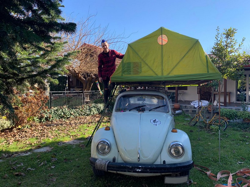 Ο Κώστας μόλις έχει ανοίξει την σκηνή επάνω στον σκαραβαίο του 1968.