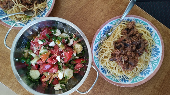 Από τα πρώτα μας μαγειρέματα. Μια ωραία μακαρονάδα με κιμά και χωριάτικη σαλάτα.