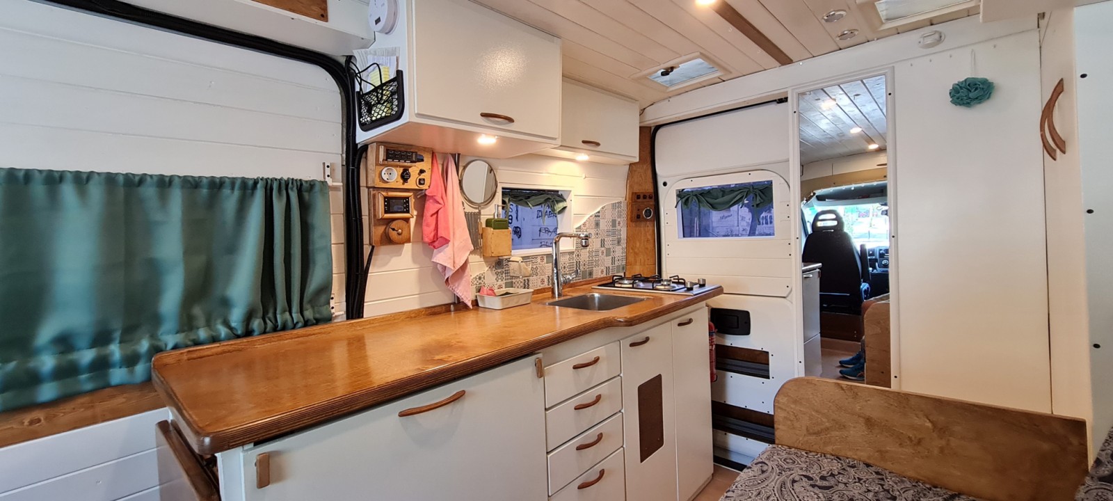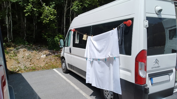 Αργότερα που τελειώσαμε με τους χορούς, κάναμε το ντουζάκι μας και είπα να δοκιμάσω μια ιδέα που είχα για απλώστρα ώστε να στεγνώνω την κουρτίνα της ντουζιέρας. Δεν είναι όμως πρακτικό γιατί πρέπει να καθαρίζω όλο το πλάι του βαν για να μην την λερώνει. Λίγους μήνες μετά την βελτίωσα βάζοντας βραχίονες ώστε να την κρατάει σε κάποια απόσταση, αλλά και πάλι, ενώ λειτουργούσε μια χαρά με άπνοια, όταν φυσούσε λίγο ακουμπούσε πάλι στα πλαϊνά και γινόταν χάλια, οπότε…. Τελικά σήμερα που έχει περάσει περισσότερο από ένας χρόνος και άπειρα ντουζάκια, απλά σκουπίζω τα πολλά νερά με το σφουγγάρι και στεγνώνει πολύ γρήγορα, οπότε δεν χρειάζομαι απλώστρα. Τον χειμώνα στεγνώνει ακόμα πιο γρήγορα όταν δουλεύει η θέρμανση.