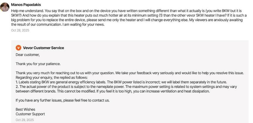 Όταν ζήτησα αντικατάσταση σε αυτό που ήταν ¨φρέσκια¨ υπόθεση, μου είπαν ότι δεν είναι 8KW, αλλά 5KW και είναι ένα λάθος στο καρτελάκι, κλπ!!! Μπήκαμε σε μια απίστευτη συζήτηση όπου απλώς επαναλάμβαναν ότι δεν είναι 8 και μπορώ να την χρησιμοποιήσω ως 5, κλπ, κλπ.