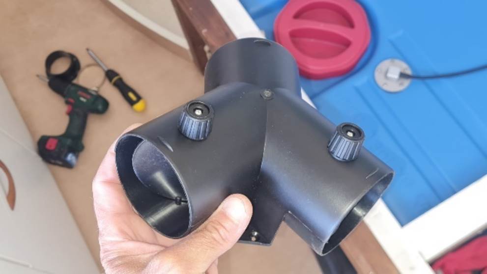 Το ¨Τ¨ που χρησιμοποίησα για να μοιράσω τον αέρα δεν είχε δυνατότητα ρύθμισης. Βέβαια, το είχα τοποθετήσει έτσι ώστε να έχω τον περισσότερο αέρα στην πλευρά της ντουζιέρας (=πολύ υγρασία άρα ανάγκη για στέγνωμα), αλλά η αναλογία ήταν 80 – 20 και ήθελα να την αλλάξω.