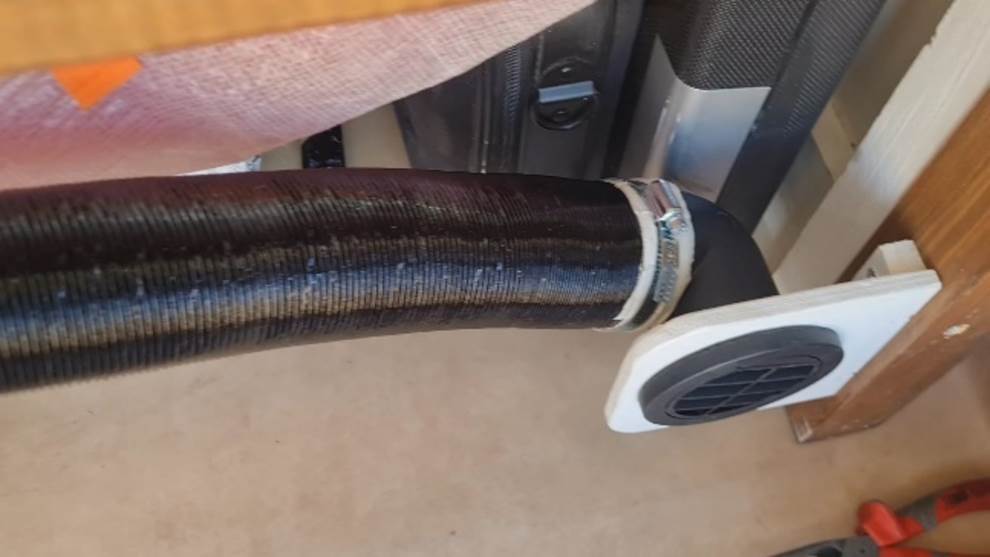Ανάμεσα σε όσα δεν πήγαν καλά με την εγκατάσταση ήταν και ότι το πορτάκι που έφτιαξα για να μπορώ να επιλέξω αν θα έπαιρνε αέρα απ΄ έξω ή από μέσα (ανακύκλωση), έπεσε μπροστά στο σουστόφυλλο της ανάρτησης και στην πράξη αχρηστεύθηκε αφού δεν μπορούσε να κλείσει. Αυτό συνέβη διότι όταν το σχεδίασα, το αυτοκίνητο ήταν σηκωμένο στα τριπόδια οπότε το σουστόφυλλο ήταν σημαντικά πιο κάτω από εκεί που βρέθηκε όταν κατέβηκε στις ρόδες του.