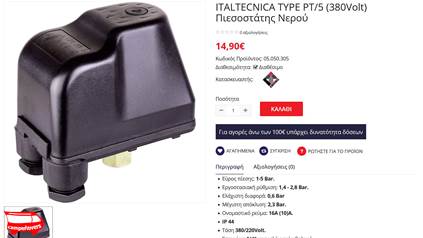 Ένα από τα μέλη που απάντησαν όμως, ο Καρφίτσας Ανδρέας, πρότεινε μια λύση με επώνυμο, αξιόπιστο και πάμφθηνο πιεσοστατικό διακόπτη, με μεγάλο εύρος ρύθμισης και ισχυρότατες επαφές, ώστε να μην με προβληματίσει ποτέ το ρεύμα που θα χρειαστεί να διαχειριστεί.