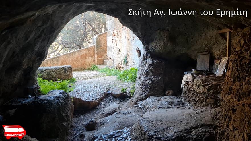 Συνεχίζοντας το μονοπάτι, περίπου 50 μέτρα πάνω από το ¨Καθολικό¨ συναντάω το σπήλαιο του Αγίου Ιωάννη του Ερημίτη. Έχει βάθος 135 μέτρα με σταλακτίτες και σταλαγμίτες και δεξαμενή με νερό.